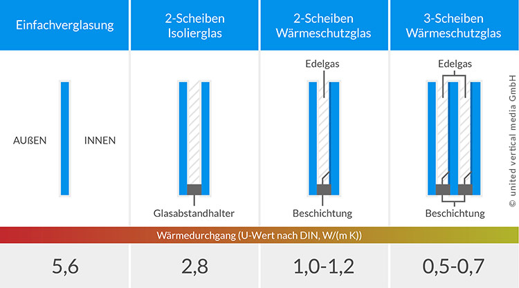 Zweifachverglasung: Diese Fenster bestehen aus zwei Glasscheiben mit einem dazwischenliegenden Luft- oder Gasraum, der als Isolierung dient. Sie bieten eine deutlich bessere Energieeffizienz als Einfachverglasung. Durch die Verwendung absorptionshemmender Beschichtungen und hochwertigeren Füllgasen, wie Argon oder Krypton, ist Zweifachverglasung ab den 1990er Jahren deutlich besser geworden. Moderne Zweifachverglasung ist daher nicht mit einer der 1970er oder 1980er Jahre vergleichbar.