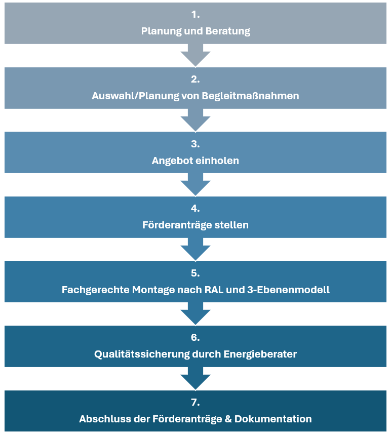 Eine professionelle Baubegleitung durch einen Energieberater ist immer sinnvoll, um die Qualität der Sanierungsmaßnahmen sicherzustellen. Im Zusammenhang mit einer BAFA-Förderung ist diese Begleitung sogar verpflichtend. Die Kosten für die Energieberatung können ebenfalls gefördert werden, entweder durch das BAFA oder im Rahmen der steuerlichen Förderung nach §35c EStG mit einem Zuschuss von 50% der Beratungskosten.